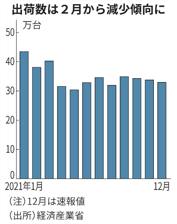 2021年の給湯器の出荷台数です。二月から減少して、